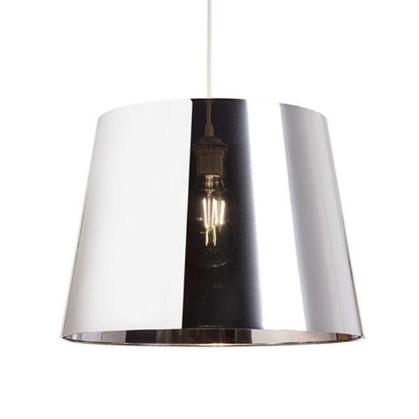 Abajur decorativo de folha de cromo, que pode ser combinado com um conjunto suspenso ou uma base de candeeiro de pé. Quando a lâmpada está acesa, ela torna-se semi-transparente e, quando desligada, possui uma superfície refletora. Acessórios adequados: HEX, ELISA, ENZO, LISA, KOMBIX, BEND, ALVIS, AMBITUS, NYC.