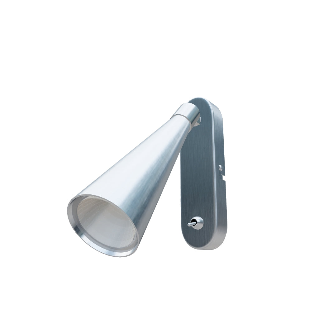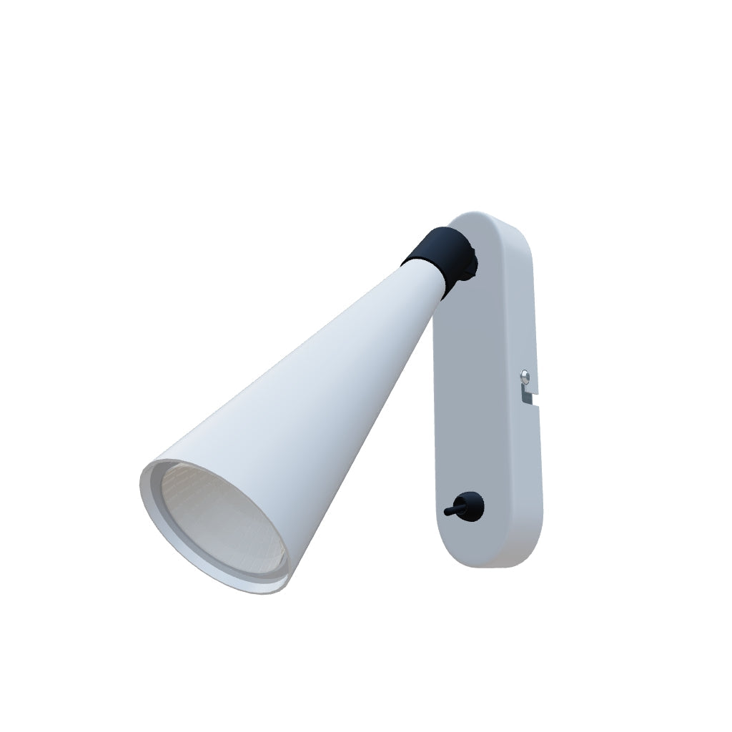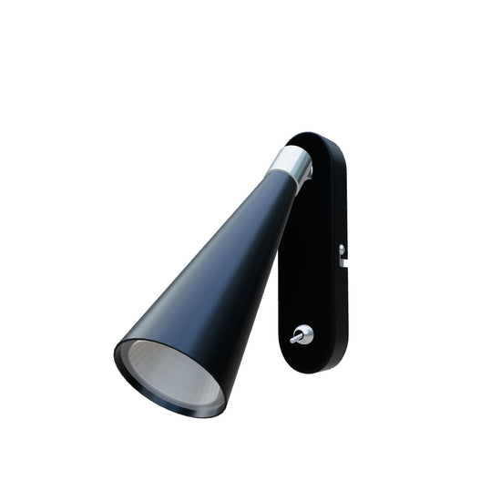 Luz de parede com refletor cônico para lâmpada LED com base GU10, apresentando um interruptor na base da luminária.