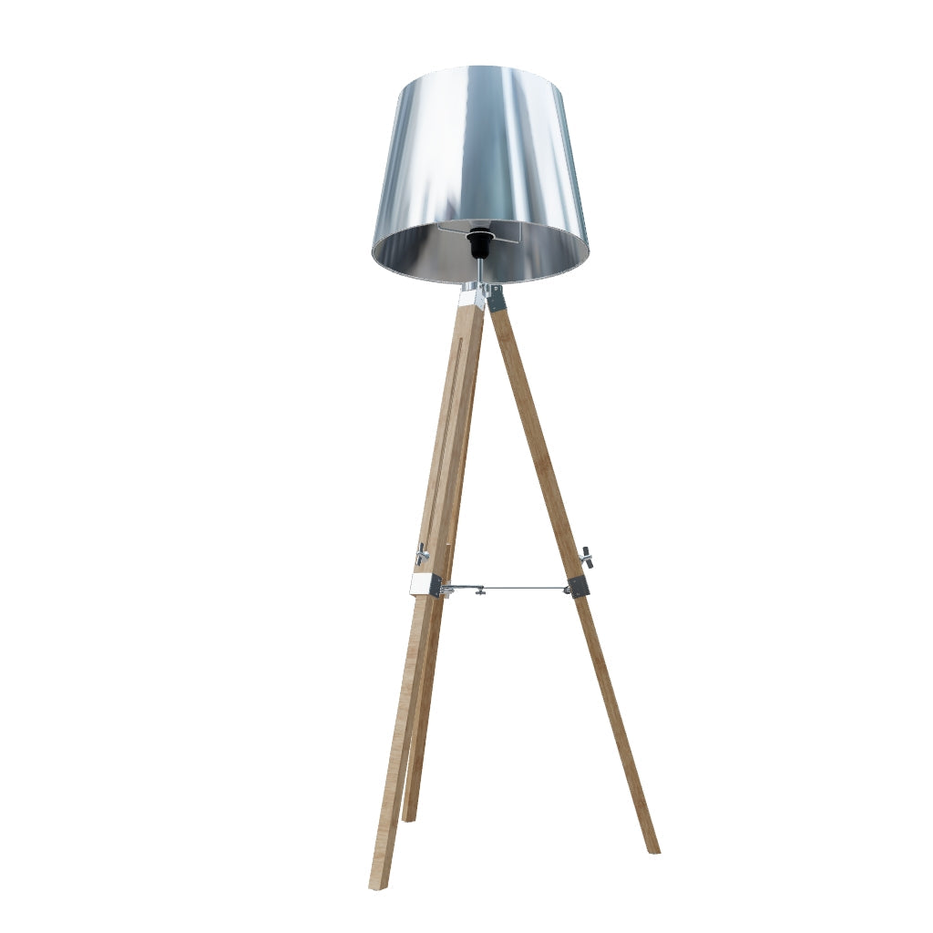 Um candeeiro de pé com um abajur feito de folha de cromo. Tem uma base em bambu regulável em altura. Adequado para fontes de luz LED E27.