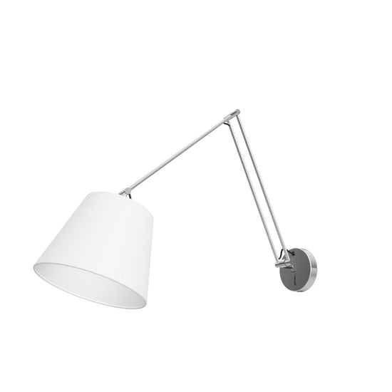 Luminária de parede com braço duplo, abajur têxtil e interruptor na base.
