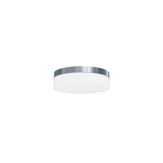 Plafon com LED integrado e abajur de vidro opalino. A base do teto pode ser em cromo ou níquel mate. Adequado para ambientes húmidos.