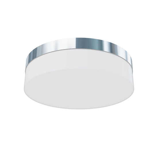 Plafon com LED integrado e abajur de vidro opalino. A base do teto pode ser em cromo ou níquel mate. Adequado para ambientes húmidos.