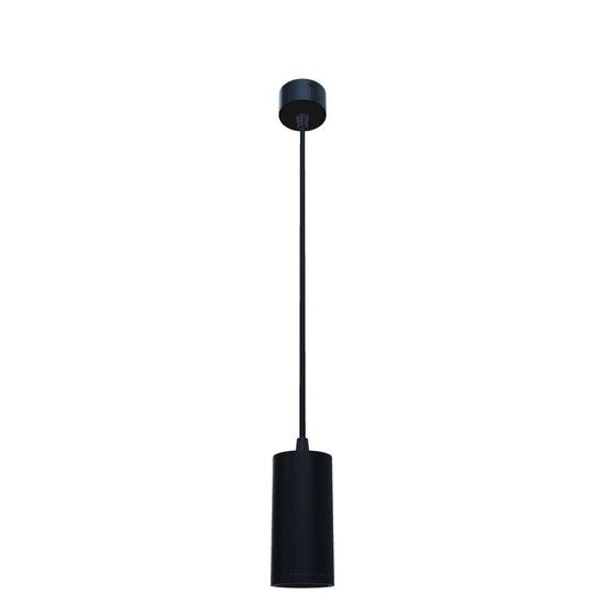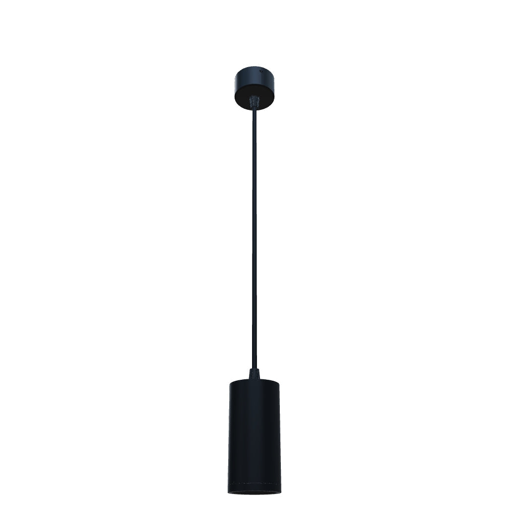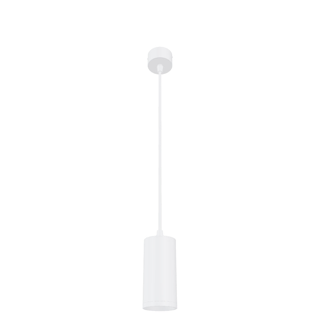 Foco suspenso cilíndrico minimalista para fontes de luz GU10 sobre base redonda. As molas ligadas ao casquilho permitem o uso de fontes de luz de vários comprimentos.