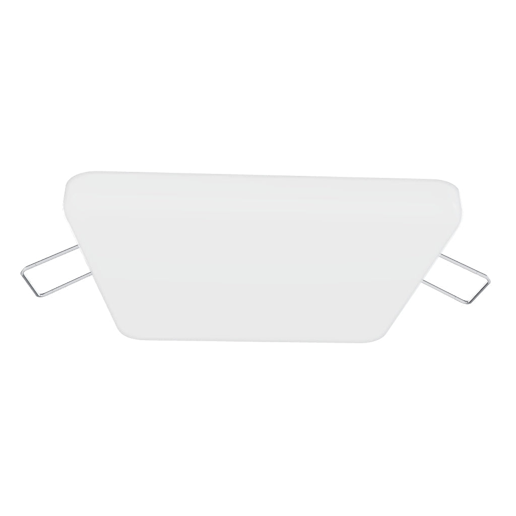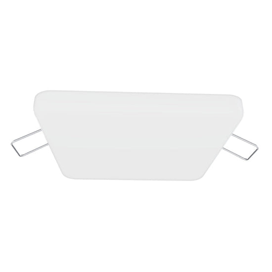 Luminária embutida sem moldura. Difusor de luz acrílico fosco levemente convexo. Adequada para áreas húmidas.