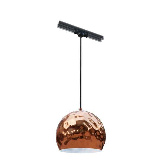 Luminária suspensa com abajur metálico texturado. O exterior do abajur é em cobre e o interior lacado a branco. Vendido com um cabo preto PVC e adaptador para calhas trifásicas.