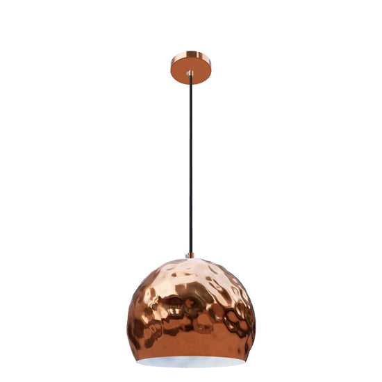 Candeeiro suspenso com abajur metálico texturado. O exterior do abajur é em cobre, o interior é lacado a branco. Inclui cabo de PVC preto e copo de cobre.