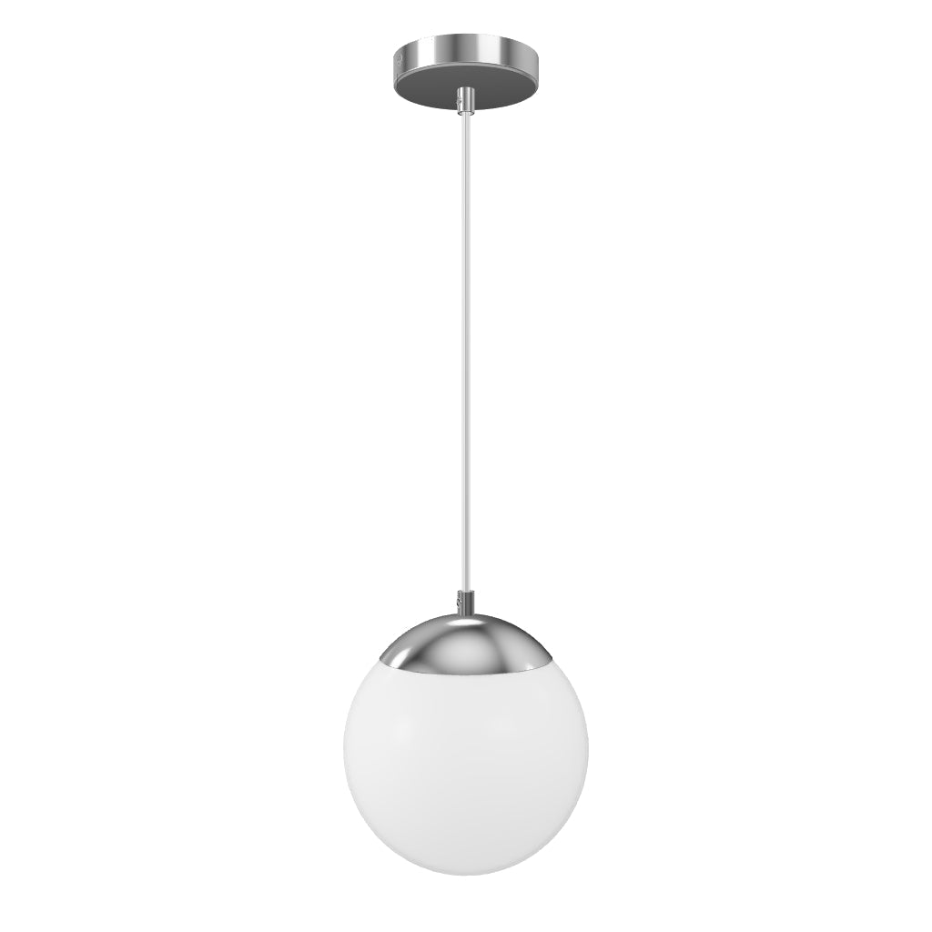 Luminária suspensa com vidro opalino e acessórios cromados. Adequado para ambientes húmidos.