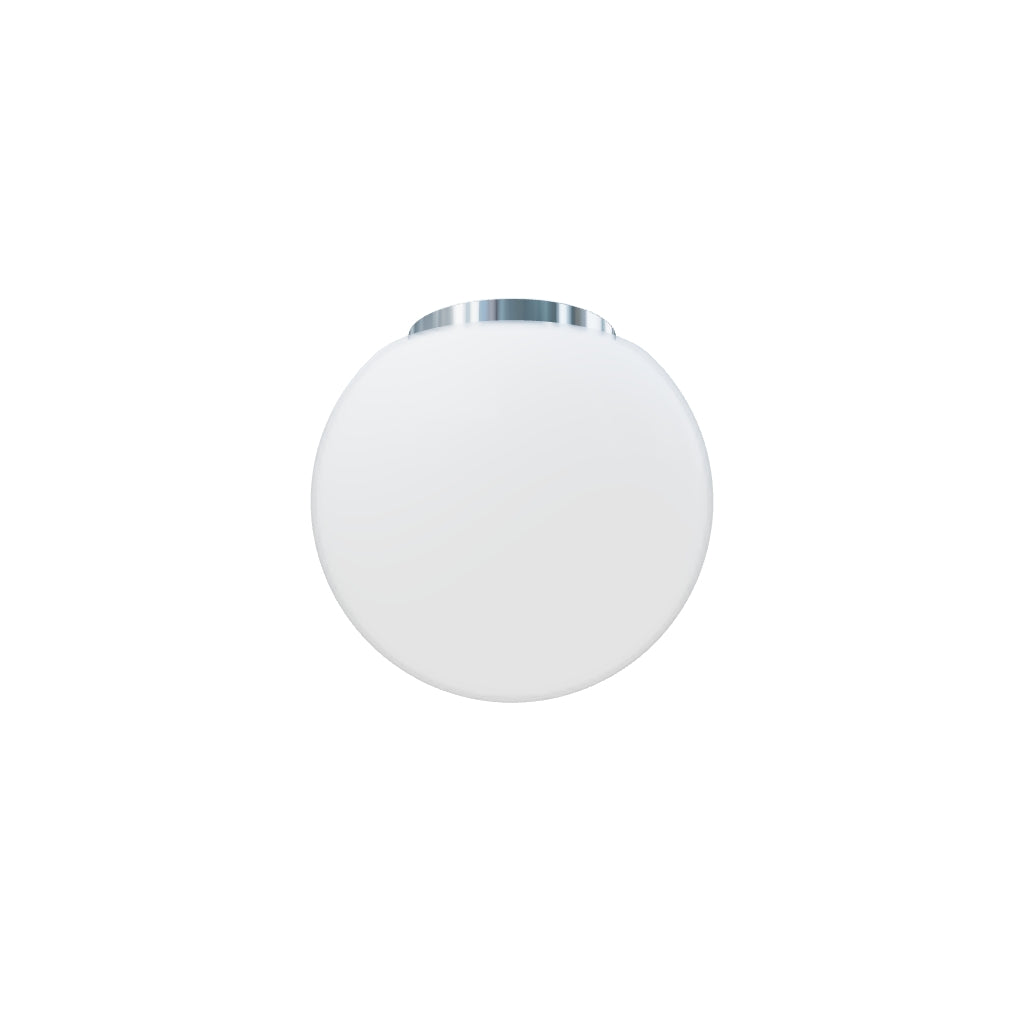 Candeeiro de teto em vidro opalino com base cromada. Adequado para ambientes húmidos.