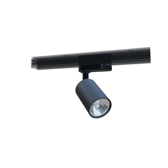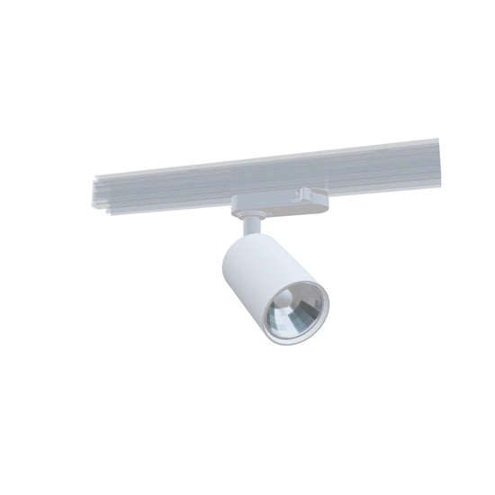 Foco cilíndrico com casquilho GU10 para fontes de luz LED e adaptador para calhas trifásicas.