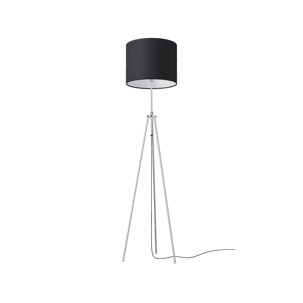 Candeeiro de pé sobre tripé permanente com ajuste de altura e abajur têxtil para casquilhos E27.