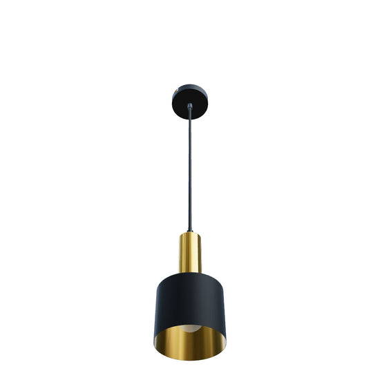 Candeeiro suspenso com abajur em metal lacado e cabo têxtil.