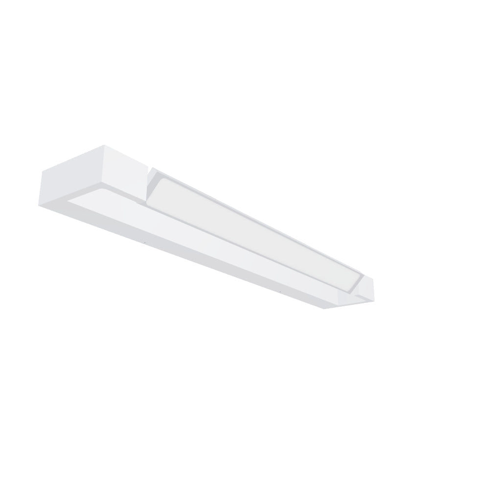 Luminária linear LED adequada para colocar acima de espelho. A frente pode girar no eixo horizontal. Para uso em ambientes húmidos.