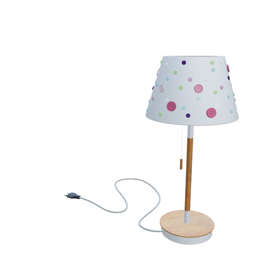 Um candeeiro de mesa com um abajur decorativo adornado com botões coloridos. A base em imitação de faia com pormenores lacados a branco inclui uma porta USB. Adequado para fontes de luz LED E27.