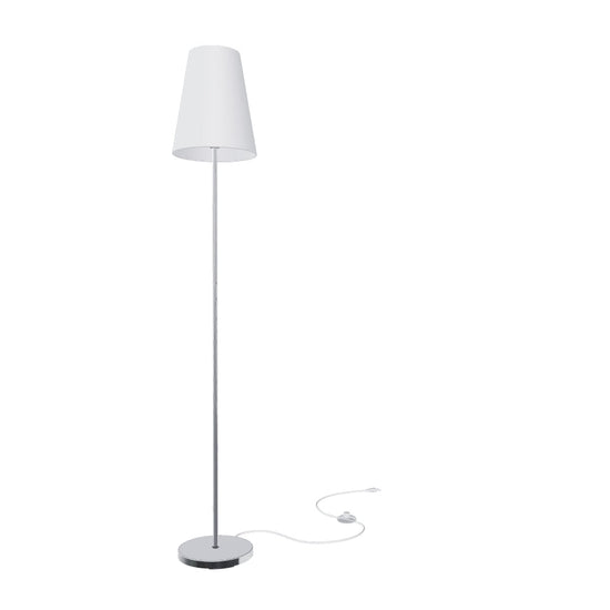 Um candeeiro de pé com uma base cromada e um abajur em tecido. Adequado para fontes de luz LED E27.