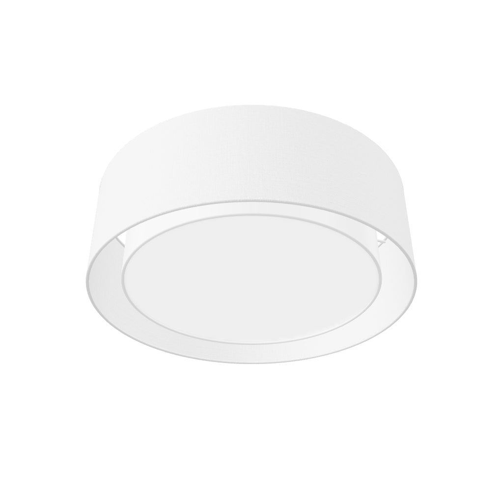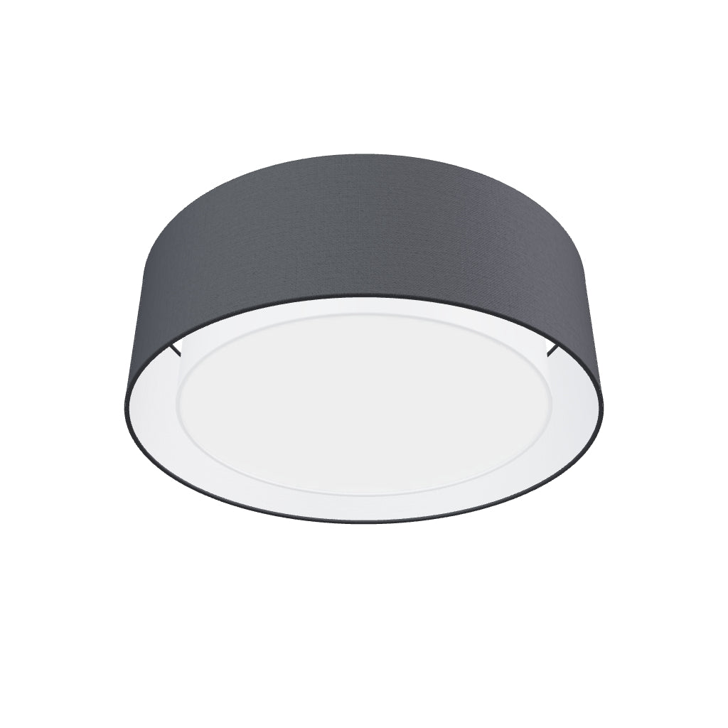 Luminária de teto redonda com abajur têxtil duplo e três fontes de luz E27. O abajur interno é sempre branco.