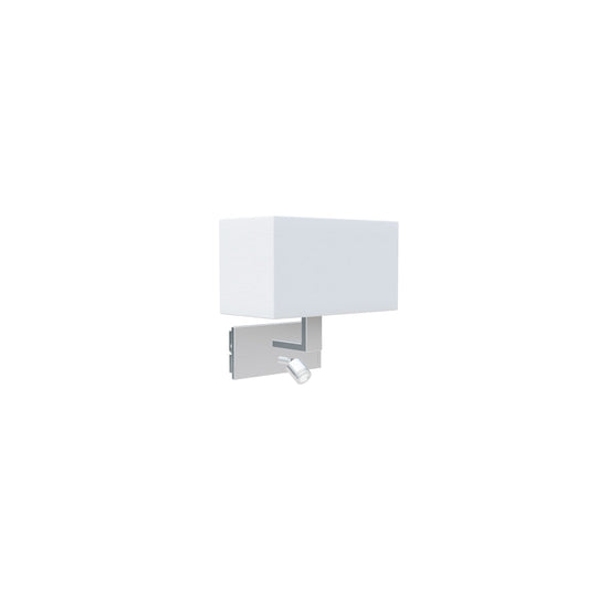 Luminária de parede com abajur têxtil texturado, para fontes de luz E27 e LED 3W para leitura. Ambas as fontes de luz são controladas separadamente por um interruptor na base.