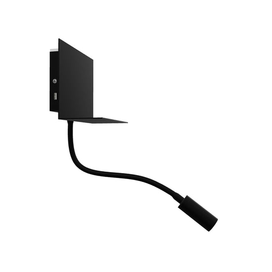 Aplique LED com prateleira para o telefone e uma porta USB integrada. O ponto de LED no pescoço flexível e a iluminação indireta são controlados separadamente por meio de dois interruptores.