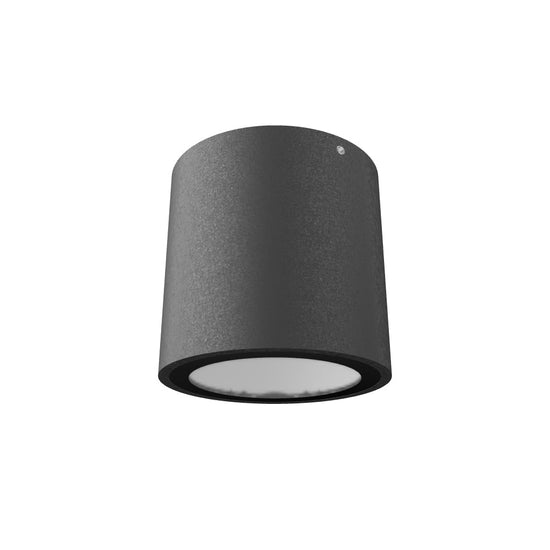 Plafon LED para exterior. Luminária cilíndrica com tampa de vidro transparente preto em todo o perímetro.