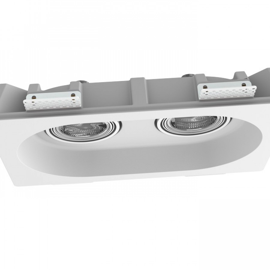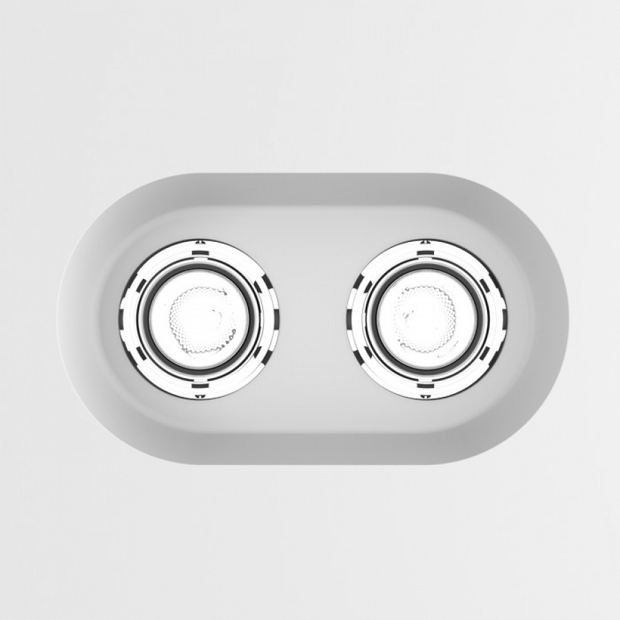 Luminária refratária de gesso com abertura oval para duas fontes de luz. Sem rebordo. As lâmpadas podem ser sobrepostas com tintas interiores. Instalação apenas em placas de pladur.